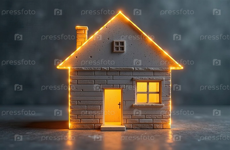 Прозрачное золото светящийся символ дома на сером бетонном фоне с золотым блеском. недвижимость, риэлтор, ипотека, страхование, бронирование, строительство, изоляция, отопление. ИИ генерируется