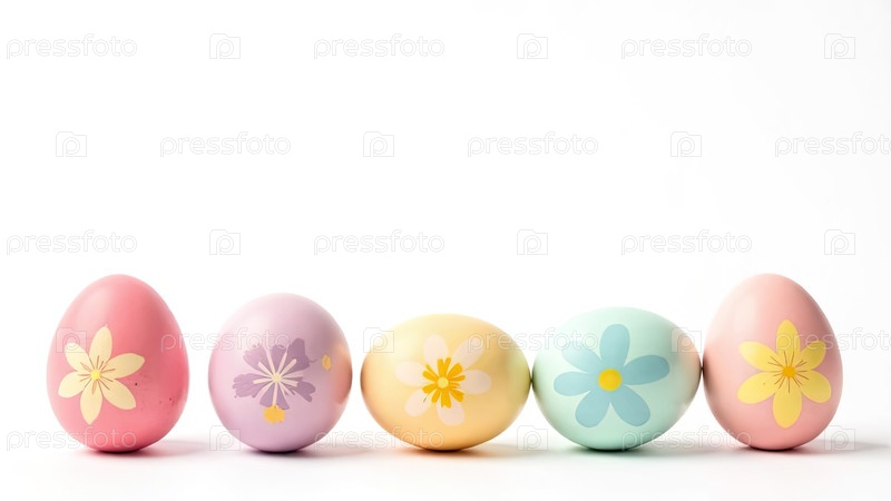 В нижней части изображения пять яиц со свободным пространством сверху для текста, креативный цветочный пастельный печат на цветах яйца, белый фон. Пасхальный баннер с пробелом для текста. ИИ генерируется