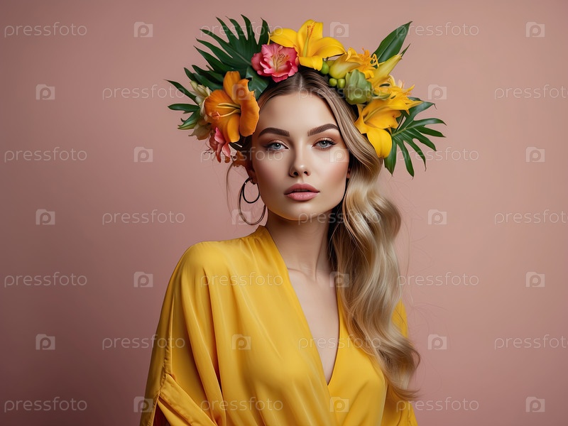 Белая женщина в желтом платье с оранжевой цветочной короной герберы, летний портрет красавицы, яркий тропический стиль, сезонное веселье