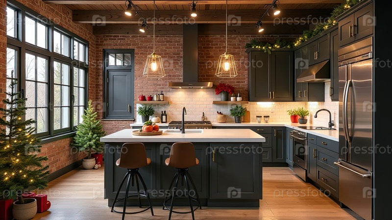 Верхний интерьер уютной современной рождественской кухни, новогоднее настроение, подготовка к празднику, посуда. Рождественский декор современной кухни, снег снаружи окна. ИИ генерируется