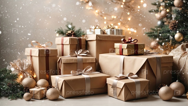 Рождественский фон с подарочными коробками с луками в нейтральных тонах естественного эко-стиля, боке и фейри-светом, рождественская елка во внутреннем интерьере дома. праздничное настроение Рождество и Новый год, открытка, созданный ИИ