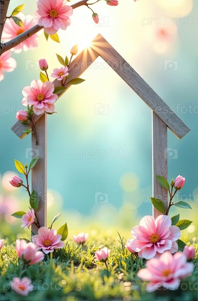 Домашняя декоративная рама в солнечных лучах, украшенная весенними пастельными цветами на весенне-синем фоне. недвижимость, риэлтор, ипотека, страхование, бронирование, строительство, изоляция. AI generated