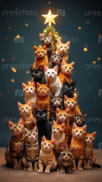 Рождественская елка из кошек сделана на праздничном фоне с блеском, многоцветная сотни котов складываются в форме высокой рождественской елки с золотыми светящимися гирляндными огнями