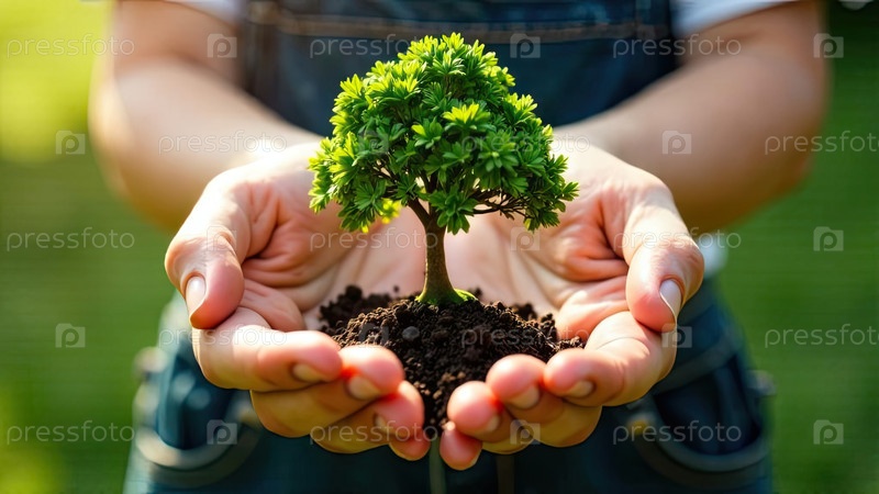 Крошечное зеленое дерево в горстке земли в руке в земле на близком расстоянии.Экология, уход, бонсай.Искусственный интеллект создан