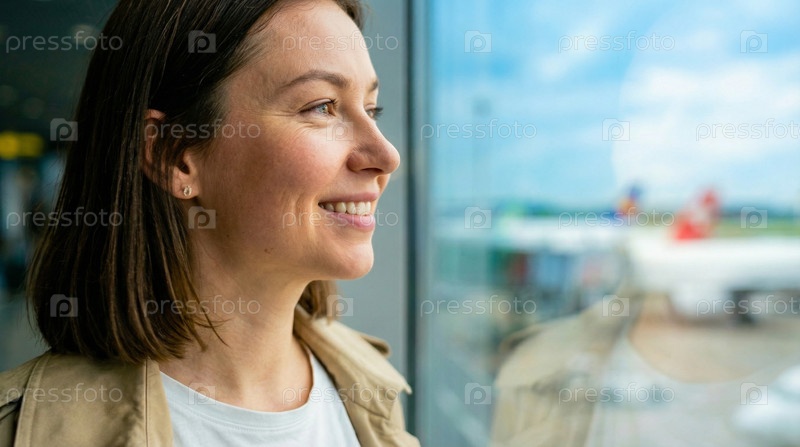Улыбающаяся женщина в профиле у окна аэропорта, радость путешествия, ожидание поездки, волнение отпуска, праздничные эмоции, современное воодушевление для путешествий