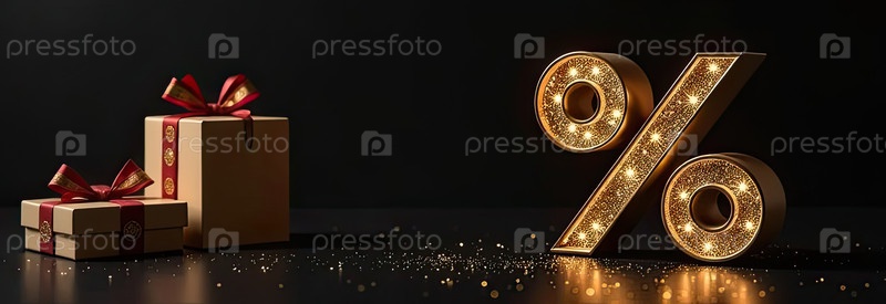 Неон светящийся золотой процентный знак на черном фоне. витрина магазина для Черной пятницы, распродажи, скидки, сумки для покупок. баннер, флаер. AI generated
