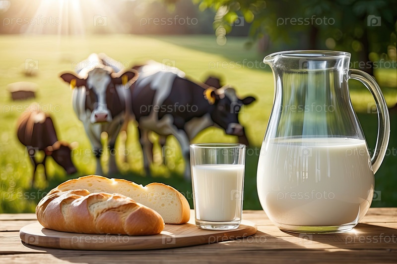 Свежее деревенское коровье молоко в кружке и белый ароматный хлеб и выпечка на столе на фоне луга, где пасутся коровы
