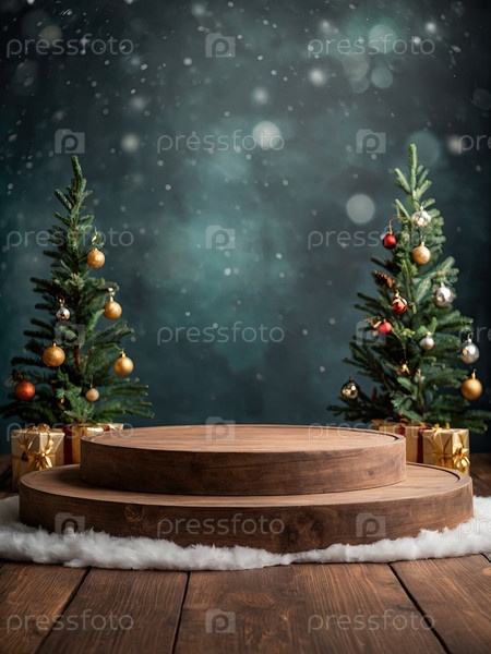Пустая подиумная площадка для демонстрации продукта, дисплейный монтаж с рождественским декором, боке, секины и фейры. Копирование пространства, Рождество и Новый год. ИИ генерируется