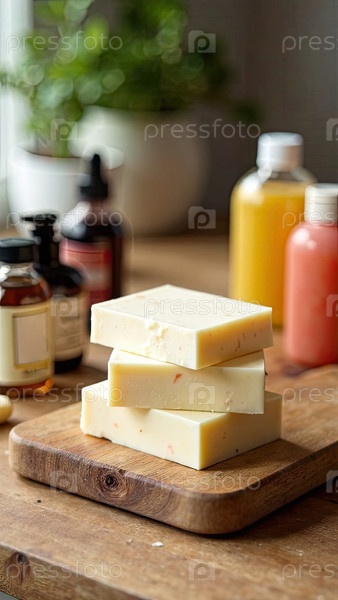 Ручно сделанный натуральный эко-сапун на деревянном столе с бутылками с ароматизатором, красителем и мыльной основой. Подарок, подарок, ремесленная домашняя гигиена. Хоби изготовление мыла, дома сделано. ИИ генерируется;