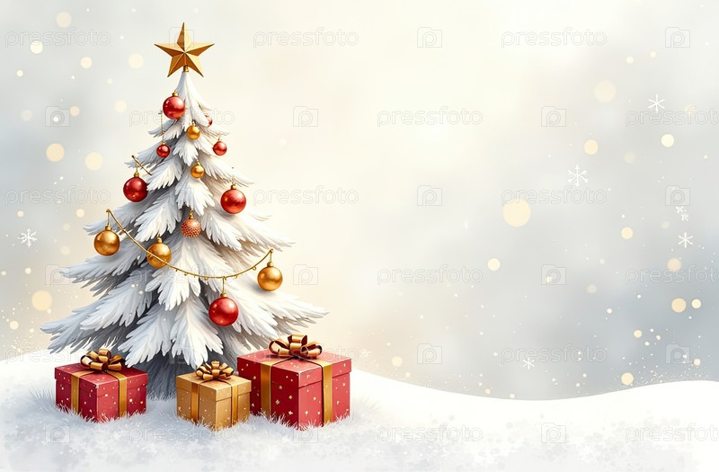 Акварельная белая и золотая рождественская елка и коробки для подарков на сияющем фоне. поздравительная карточка на Рождество и Новый год с копировальным пространством. созданный ИИ