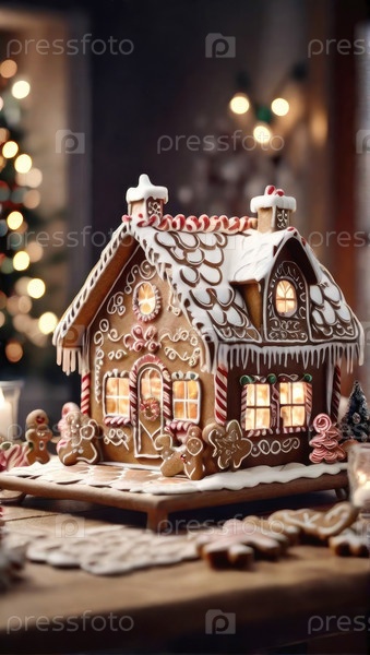 Традиционный дом с имбирем в рождественском декоре и фейриные огни на новогоднем фоне. вкусная ароматная сладость, домашние торты, комфорт в доме, интерьер дома. ИИ генерируется