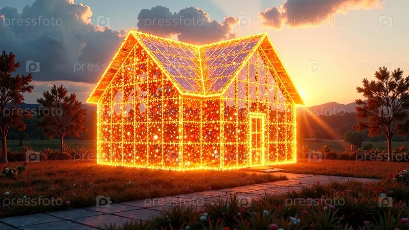 Прозрачное золото светящийся проект дома в натуральном размере на земельной площади. недвижимость, риэлтор, ипотека, страхование, здания, строительство, изоляция, отопление. ИИ генерируется