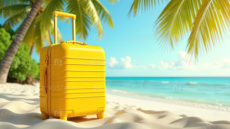 Желтый чемодан на тропическом пляже - это поездка к морю в теплый летний климат, туристическая экскурсия