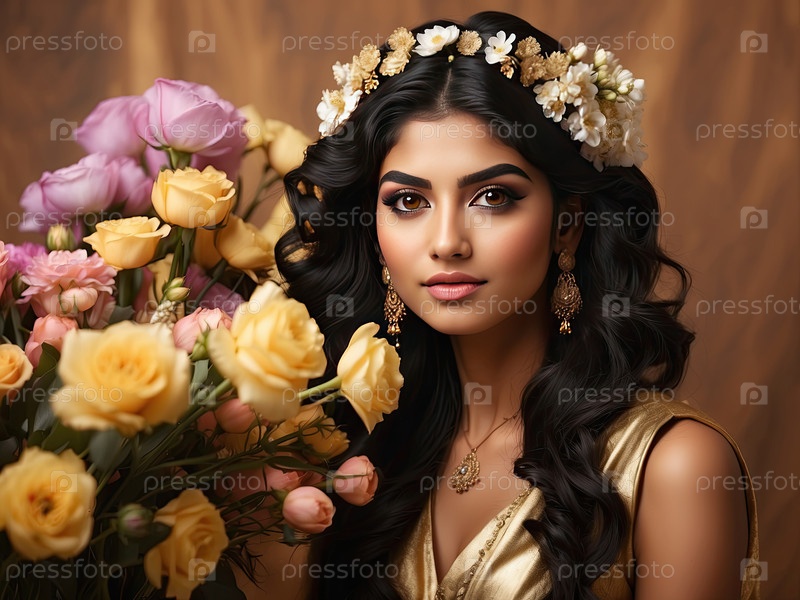 Индийская женщина с цветочной прической и золотыми розами, темный фон, портрет весенней красоты, женственность, цветовая фантазия, 8 марта, женский день
