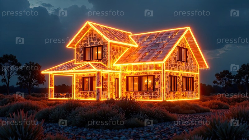 Прозрачное золото светящийся проект дома в натуральном размере на земельной площади. недвижимость, риэлтор, ипотека, страхование, здания, строительство, изоляция, отопление. ИИ генерируется