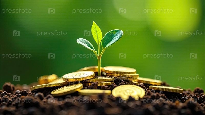 Молодой зеленый побег растет из земли и золотые монеты вблизи на зеленом фоне. Экономика, финансы, экология, стартап. ИИ генерируется