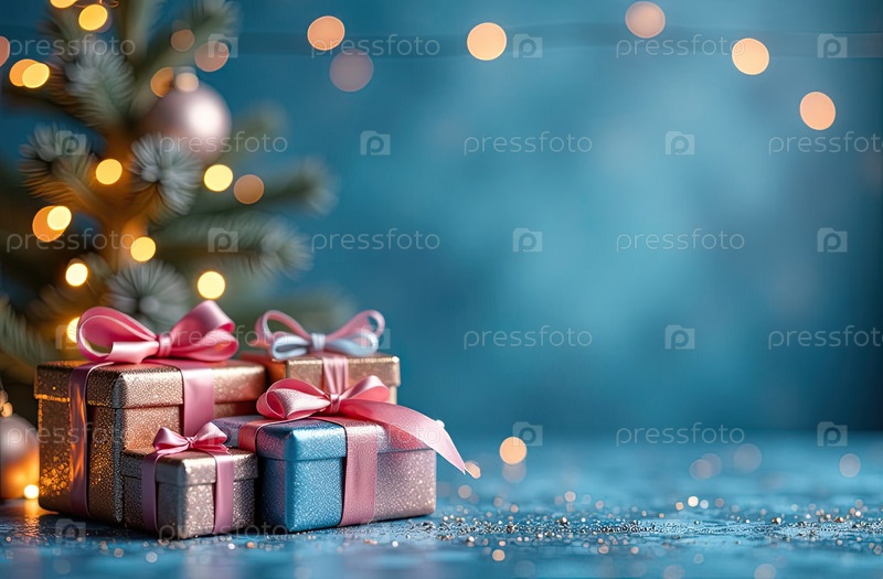 Рождественский фон с голубыми и розовыми коробками для подарков с лучами, светящимся боке и блеском. Праздничное настроение Карта на Рождество и Новый год с копировальным пространством. ИИ генерируется