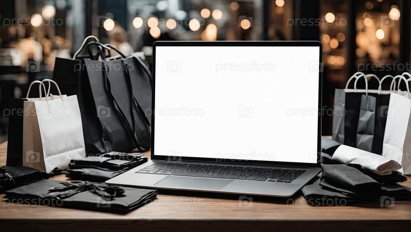 Ноутбук с белым экраном макет на столе в офисе в торговом центре рождественского декора с сумками, сумочками для покупок, пакетами, Черная пятница,