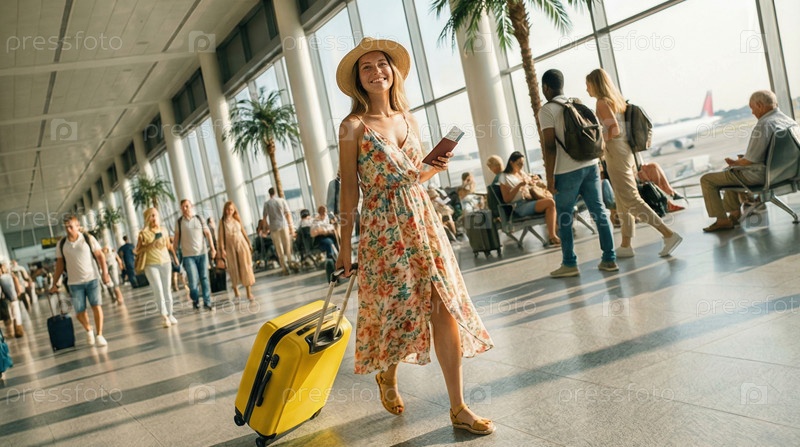 Женщина в летнем платье и шляпе, прокатывающая желтый чемодан через терминал аэропорта, путешествие, свобода и исследование, отпускное настроение, ожидание