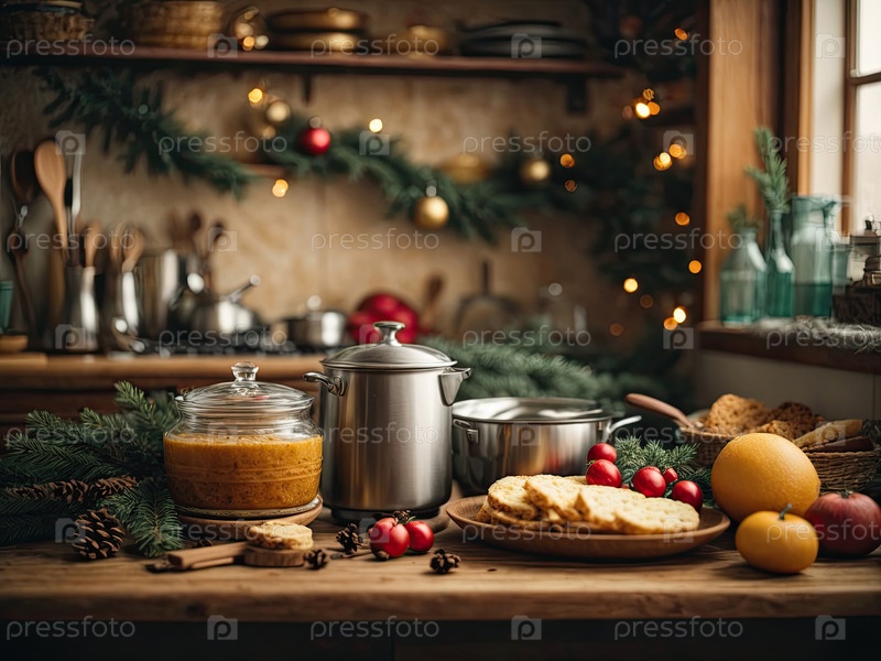 Уютная деревенская кухня с рождественским декором, новогоднее настроение, подготовка к празднику, посуда.Счастливого Рождества и счастливого Нового года поздравительную карточку, тепло дома.Искусственный интеллект генерирует
