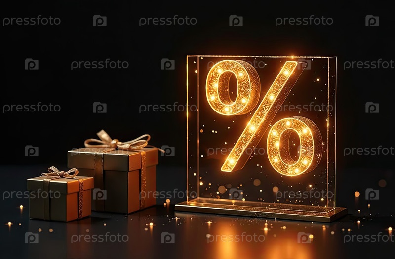 Неон светящийся золотой процентный знак на черном фоне. витрина магазина для Черной пятницы, распродажи, скидки, сумки для покупок. баннер, флаер. AI generated