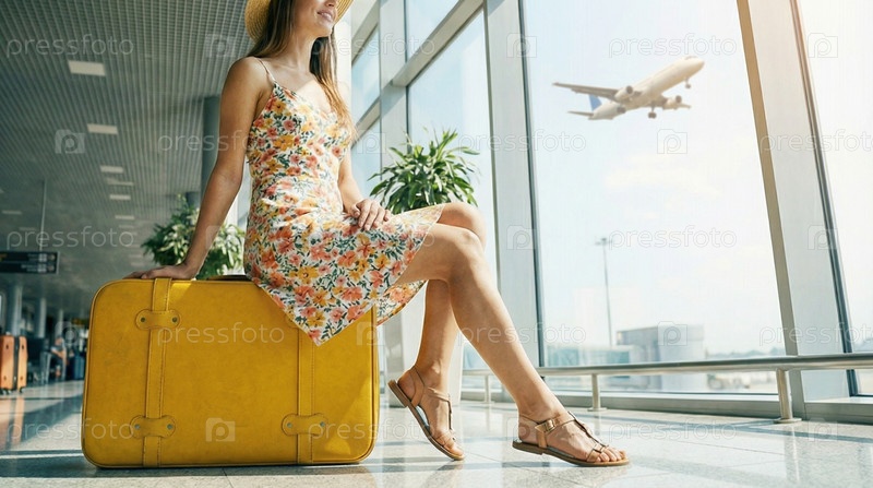 Женщина с чемоданом и шляпой сидит у окна аэропорта, наблюдая за самолетами, ожиданием отпуска, настроением путешественника, вдохновением для поездки, моментом терминала аэропорта