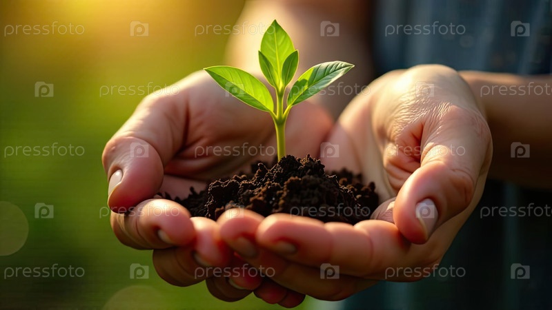 Молодой зеленый побег в горстке земли в ладонях фермера растений в земле на близком расстоянии