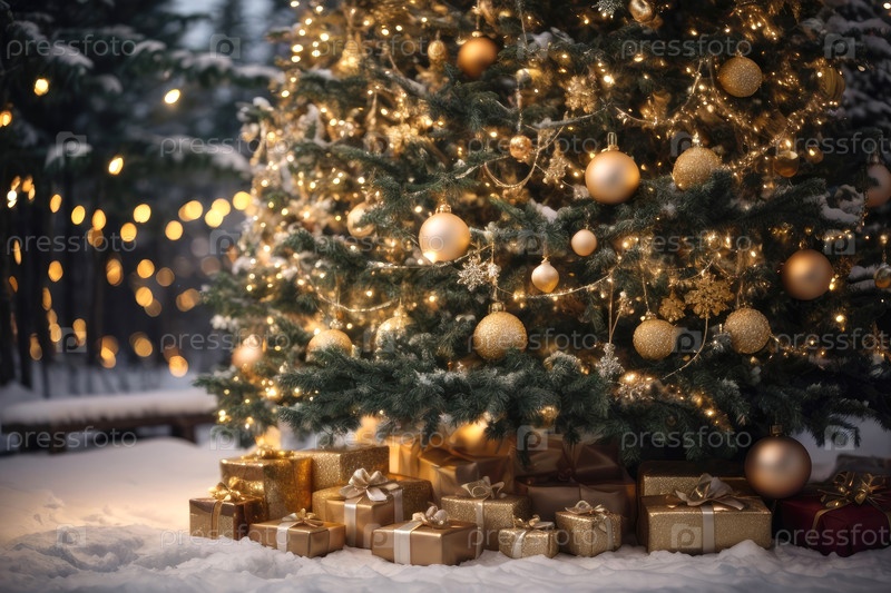 Фея Рождественская елка светит теплыми фейриными огнями с золотым декором в лесу зимой со снегом, коробки с подарками лежат под елой.Рождество и Новый год, праздничное настроение, поздравительная открытка