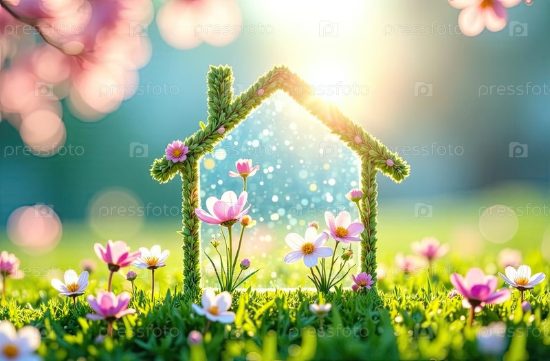 Крошечный экологический дом теплица в солнечных лучах, с весенними пастельными цветами на весеннем пастельно-синем фоне. недвижимость, риэлтор, ипотека, страхование, бронирование, строительство, изоляция. ИИ генерируется