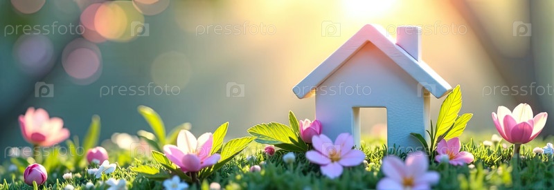Крошечный дом в солнечных лучах, украшен весенними пастельными цветами на весеннем пастельно-синем фоне. недвижимость, риэлтор, ипотека, страхование, бронирование, строительство, изоляция. ИИ генерируется