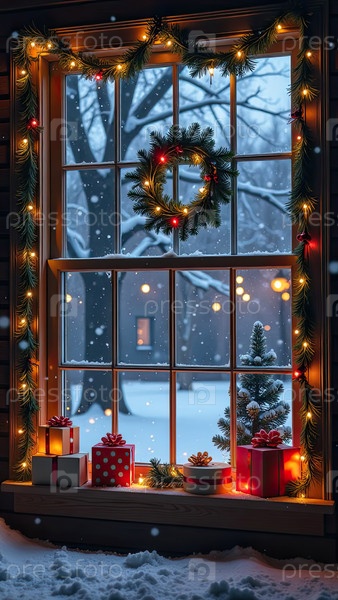 Внутреннее уютное окно с рождественским декором и теплым светом - вид изнутри зимой и снегом. отпразднуйте Рождество и Новый год, елку, боке, снег. ИИ генерируется
