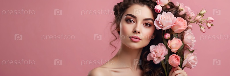 Брюнетка с цветочной короной и розовыми каплями на ушах, розовый фон, портрет весенней красоты, романтика, женственность, 8 марта, женский день