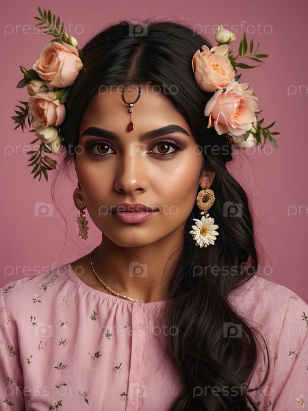 Индийская женщина с распущенными волосами и цветочным головным убором, розовый фон, портрет весенней красоты, естественная элегантность, женственность, 8 марта, женский день