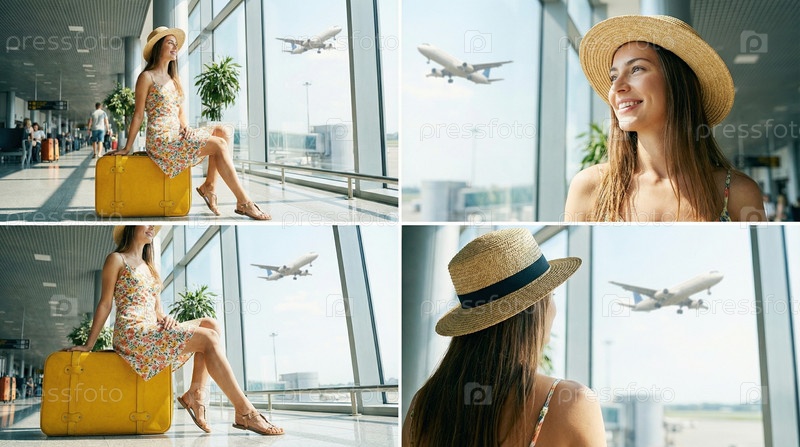 Женщина в шляпе сидит у окна аэропорта с чемоданом, глядя на самолеты, путешественное вдохновение, настроение поездки, ожидание отъезда на каникулы
