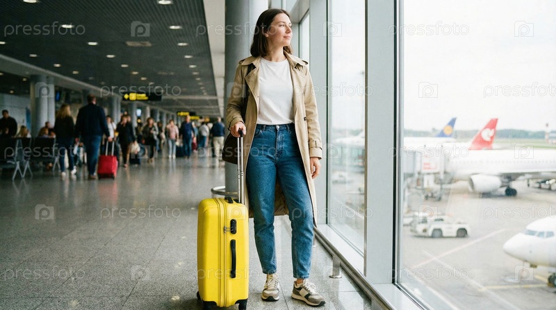 Женщина с чемоданом стоит возле окна современного терминала аэропорта, смотрит наружу в ожидании полета, свободы передвижения, путешествия на каникулах, начала поездки