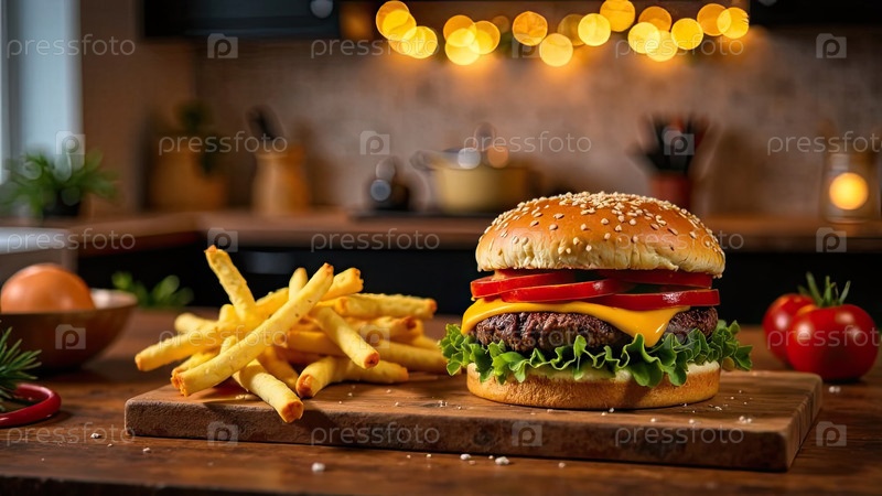 Вкусные бургеры и картофель фри в домашней кухне с рождественским декором, огнями гирлянды. доставка из ресторана быстрого питания, меню гамбургера домашнее приготовление на Новый год. ИИ генерируется;