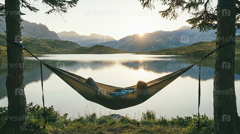 Гамак, висящий между деревьями над озером при восходе солнца, мирный отдых, релаксация на открытом воздухе, спокойное туристическое убежище, досуг в природе
