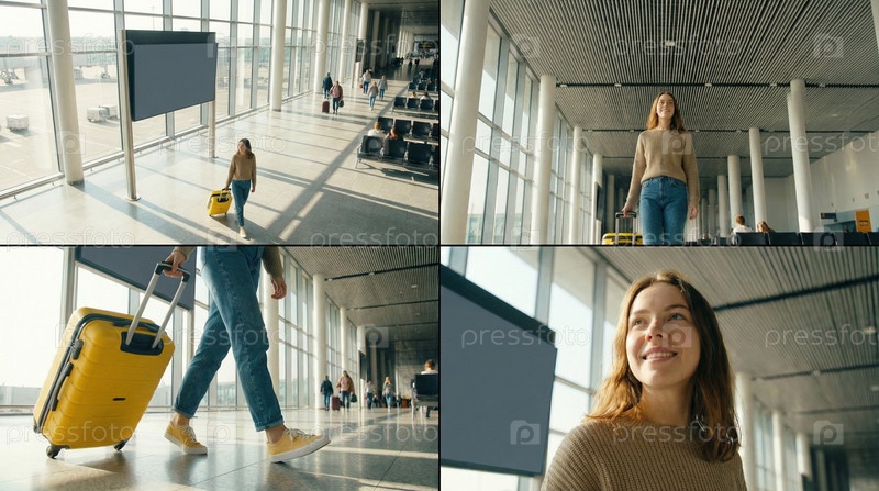Женщина с желтым чемоданом в стильном наряде стоит в терминале аэропорта, ожидание поездки, ожидание рейса, начинается путешествие, приключение города-аэропорта