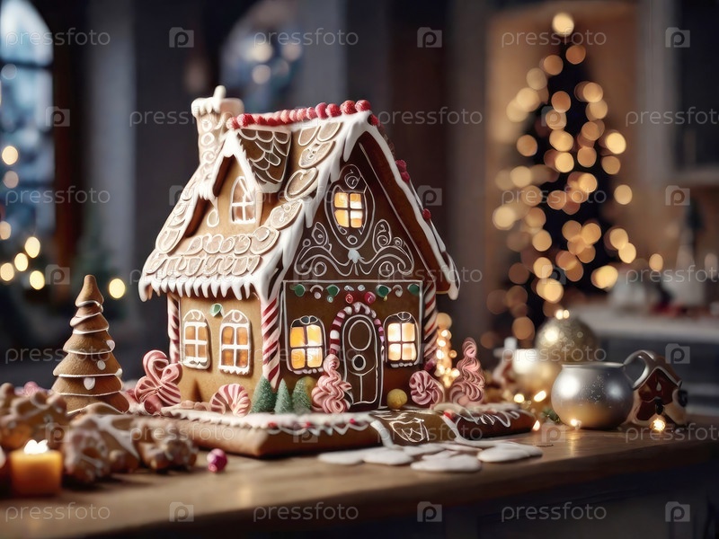 Традиционный дом с имбирем в рождественском декоре и фейриные огни на новогоднем фоне. вкусная ароматная сладость, домашние торты, комфорт в доме, интерьер дома. ИИ генерируется