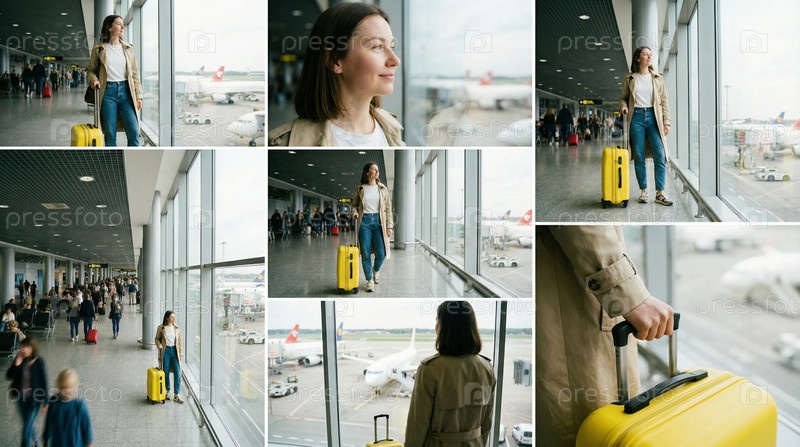 Коллаж молодой женщины, путешествующей с чемоданом в современном аэропорту, ожидания на терминале, приключения поездок, ожидание, поездка в аэропорт