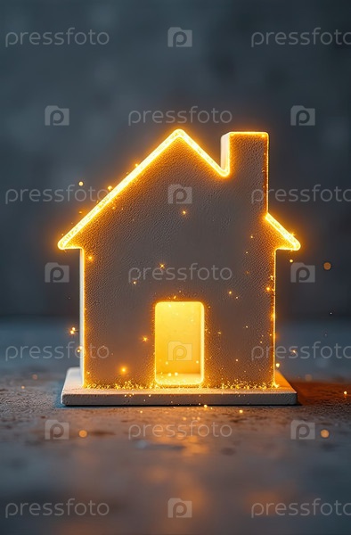 Прозрачное золото светящийся символ дома на сером бетонном фоне с золотым блеском. недвижимость, риэлтор, ипотека, страхование, бронирование, строительство, изоляция, отопление. ИИ генерируется