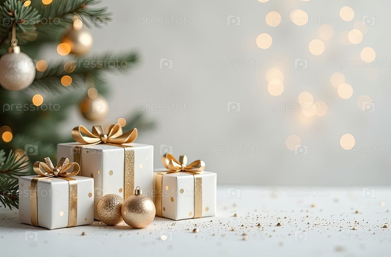 Рождественский фон с белыми коробками для подарков со золотыми лучами, светящимся боке и блеском. Праздничное настроение Карта на Рождество и Новый год с копировальным пространством. ИИ генерируется