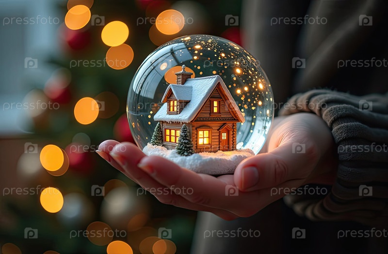 Магический стеклянный шар с крошечным современным домом и снегом внутри в уютной руке с рождественской елкой с гирляндами на фоне. страхование, ипотека, покупка недвижимости. ИИ генерируется