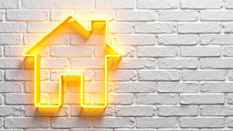 Прозрачное золото светящийся символ дома на фоне белой кирпичной стены. недвижимость, риэлтор, ипотека, страхование, бронирование, строительство, изоляция, отопление. AI generated