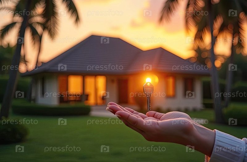 Рука риэлтора с ключами от дома для пляжного отдыха в жарких тропиках с пальмами. Резервации гостиниц, бронирование, переезд в новый дом, ипотека, аренда и покупка недвижимости. ИИ генерируется