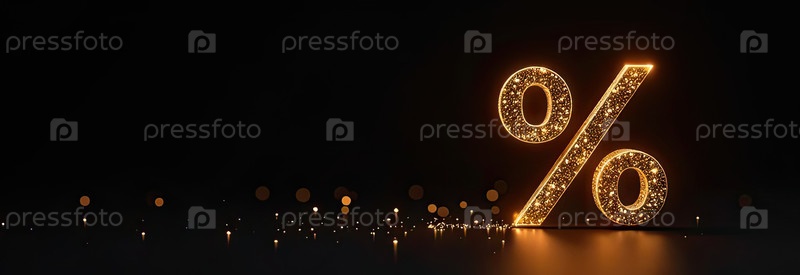 Неон светящийся золотой процентный знак на черном фоне. витрина магазина для Черной пятницы, распродажи, скидки, сумки для покупок. баннер, флаер. AI generated