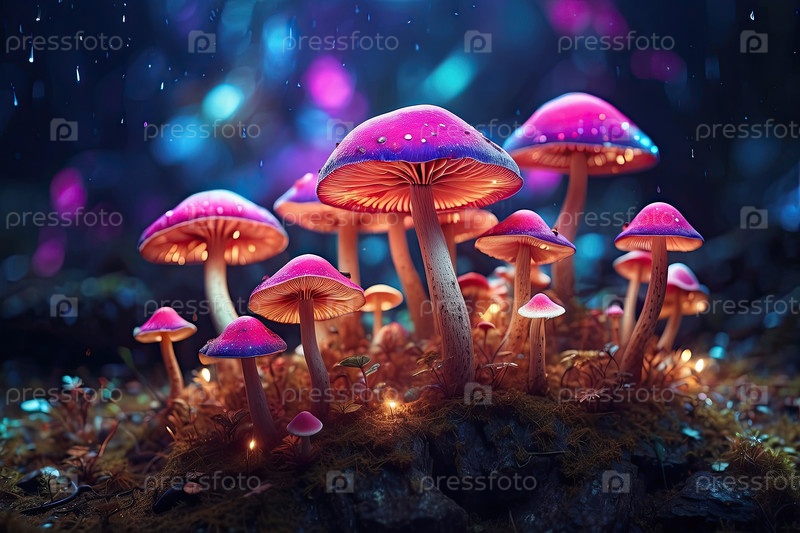 Волшебное светящееся грибное кольцо, псилоцибин в фантастическом пейзаже, галлюциногенные споры, психоделическое празднование, риск наркомании