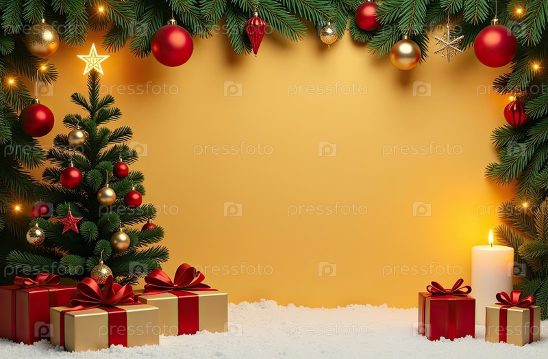 Рождественские поздравительные открытки приглашение с пространством для текста в раме на золотом фоне со светящейся рождественской елкой и гирляндой, шарами, подарочными коробками