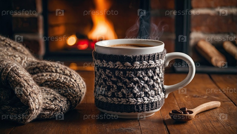 Теплая чашка кофе возле камина в уютном теплом трикотажном платье и рождественский декор.Уютная зима, Рождество, Новый год. ИИ генерируется