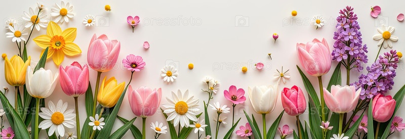 Рамка с весенними цветами тюльпаны, нарциссы на белом фоне - Весенняя открытка со свободным текстом для 8 марта, женского дня, Пасхи